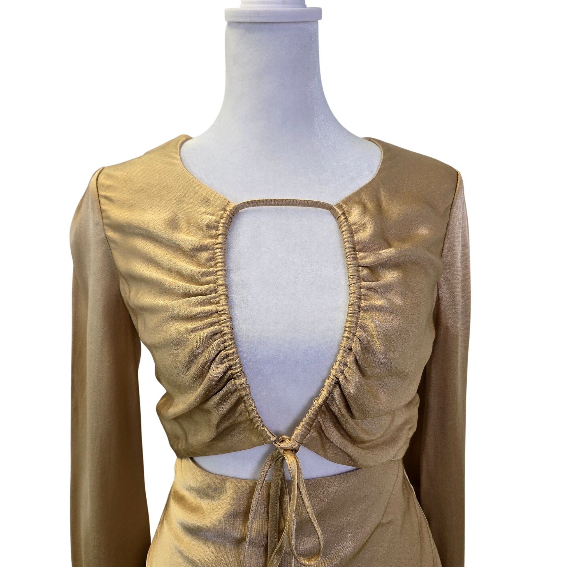 Sold at Revolve, cut out front mini dress in a silk touch fabric with a luxurious sheen. Color is Gold