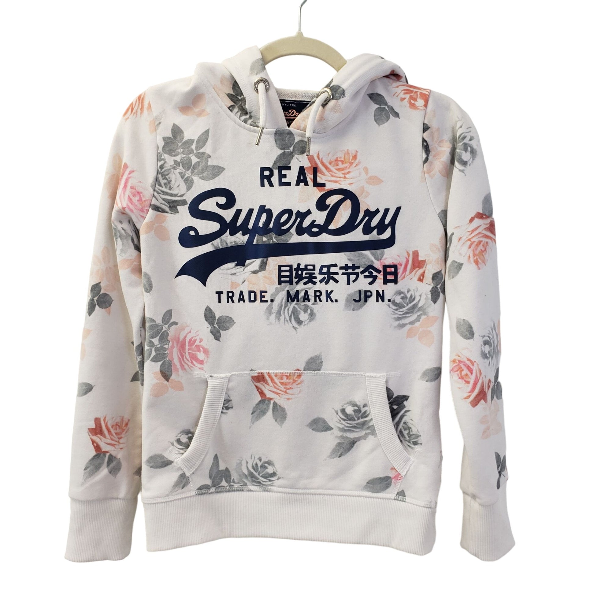 Superdry women's Vintage Logo photo rose all over print hood. This overhead hoodie features a drawstring hood, ribbed cuffs and hem and a front pouch pocket. The hoodie is completed with a logo graphic on the chest and small logo tab in the side seam.