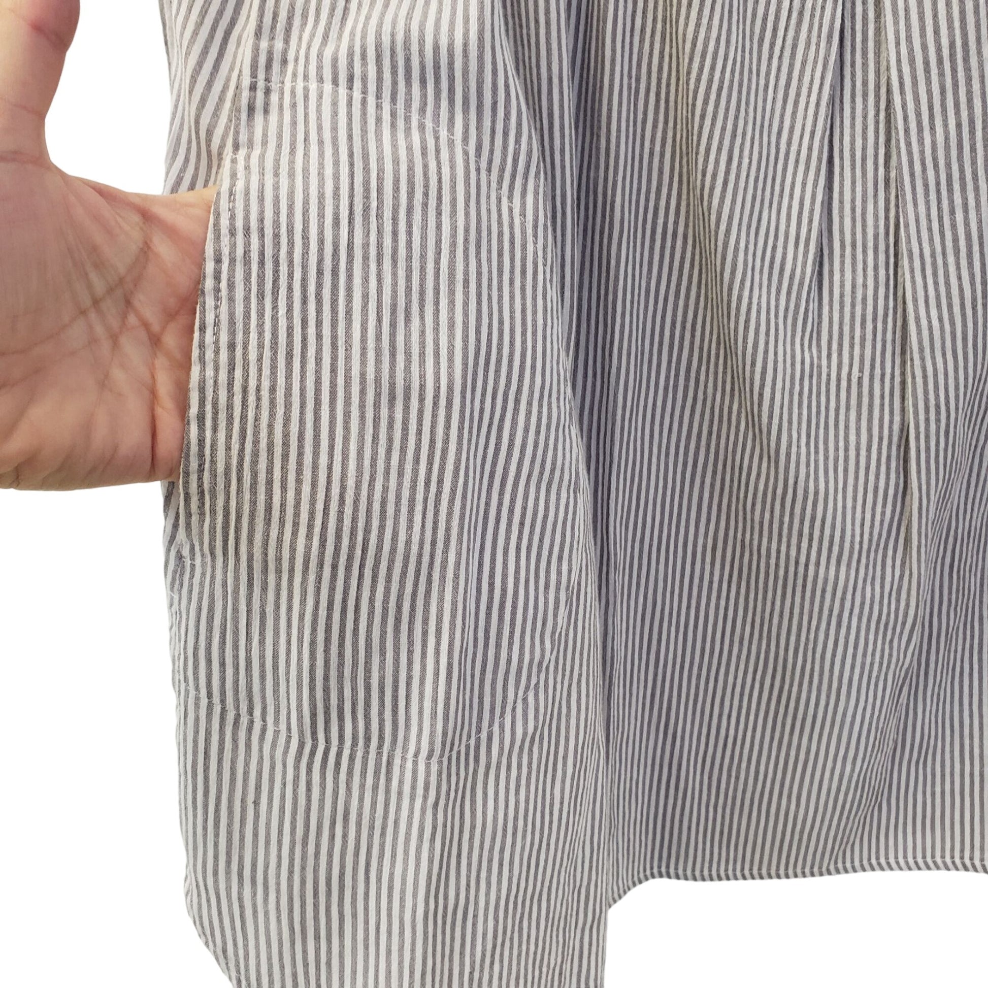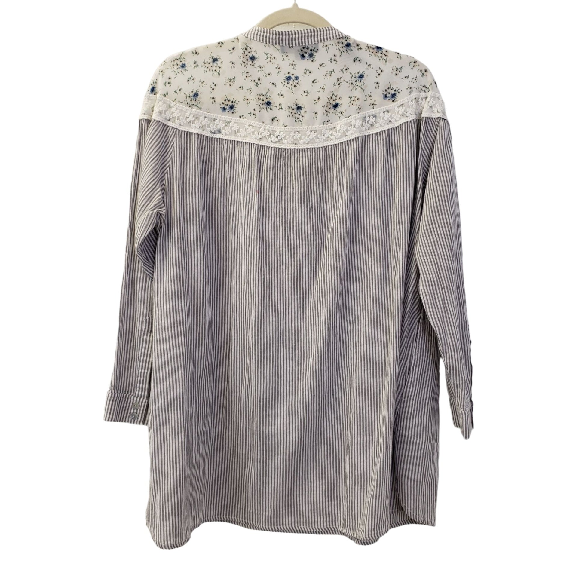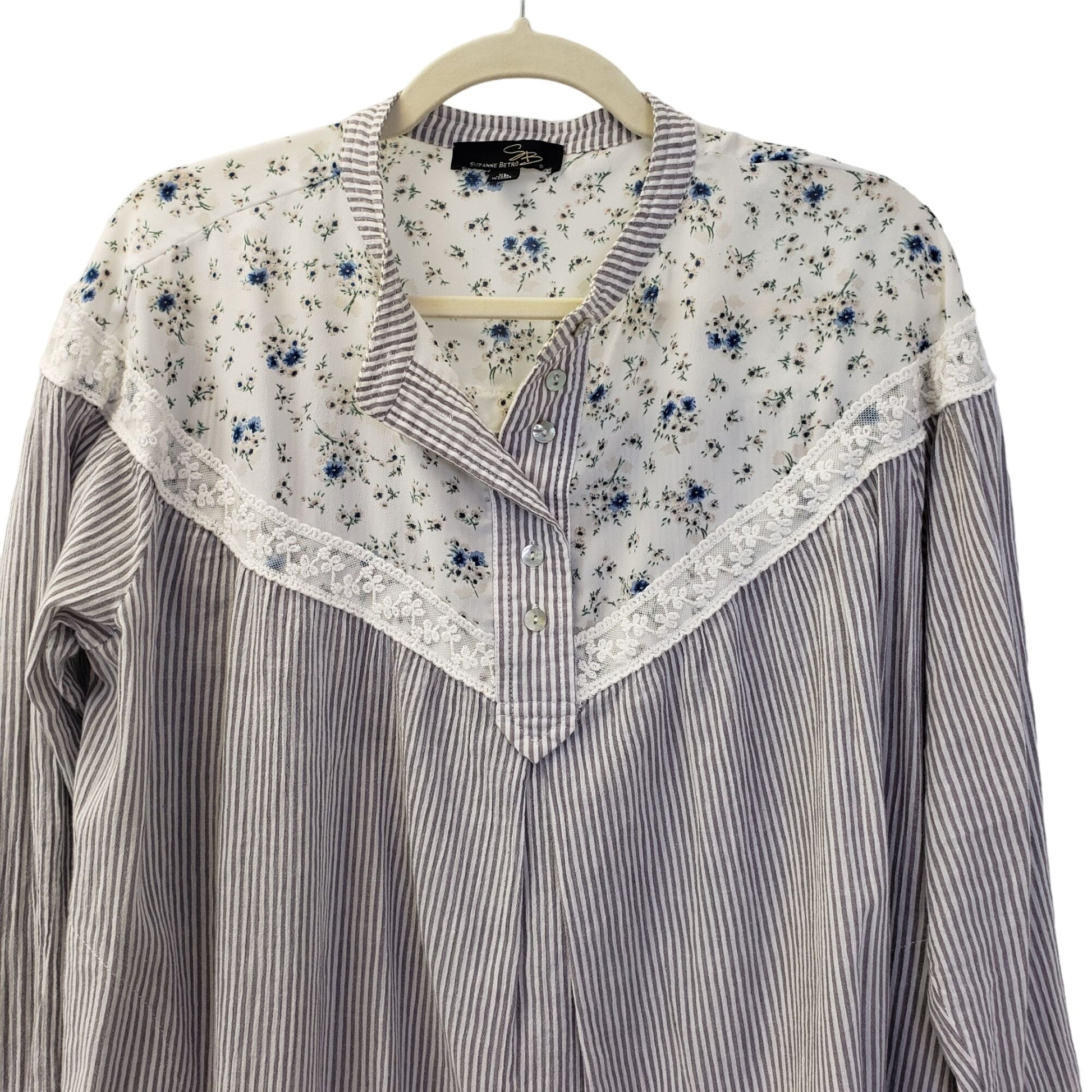 Nice and lightweight top that has a mixed media and mixed print design with a floral pattern and lace trim at the bustline and the rest of the top is striped. Babydoll style with side pockets. Great piece to wear to a festival or take on vacation.