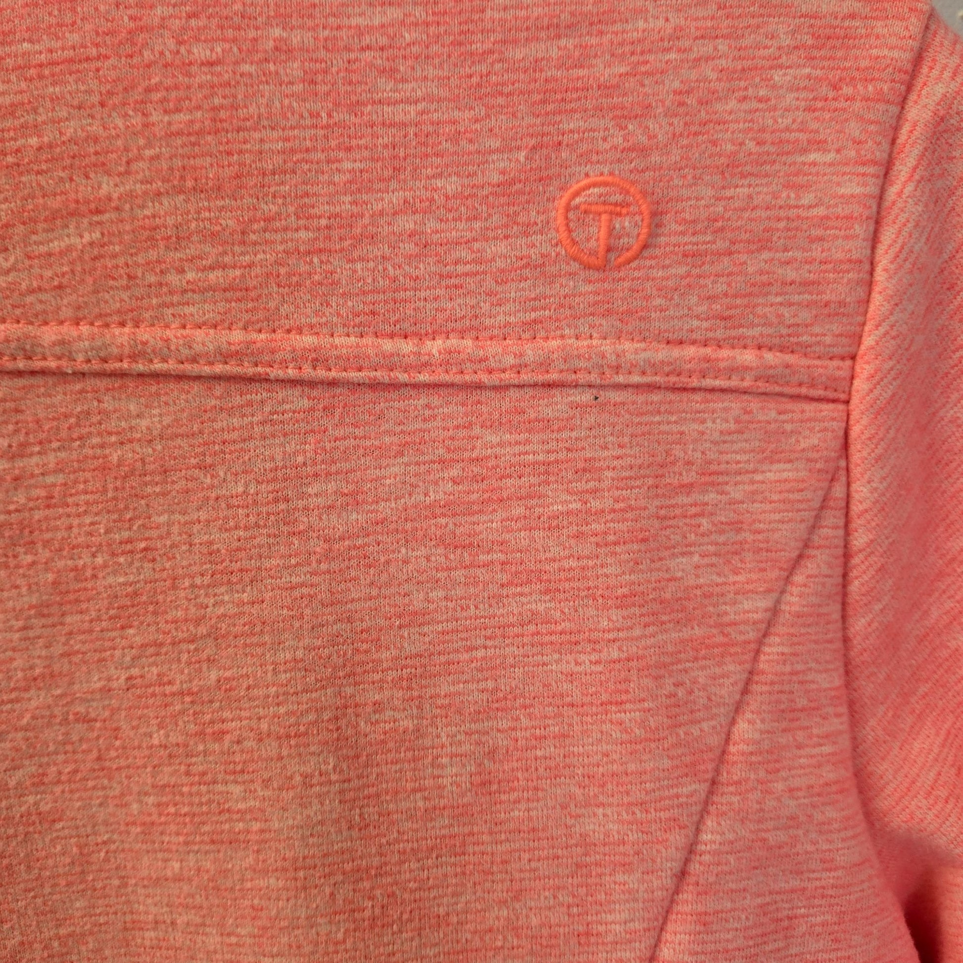 Really nice full zip activewear jacket that has a light fleece lining, zipper closure pockets on the front and branded zipper pull. The color is like a bright neon pink and white heathered color way.