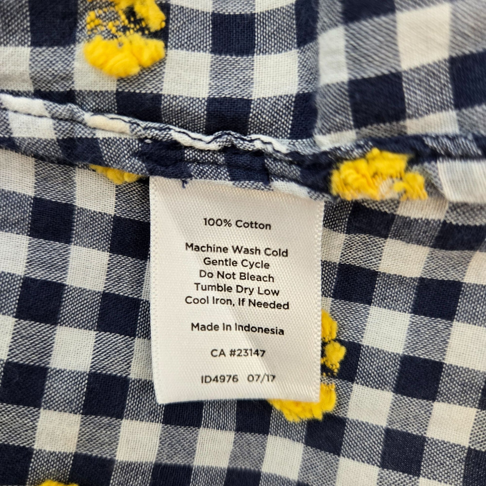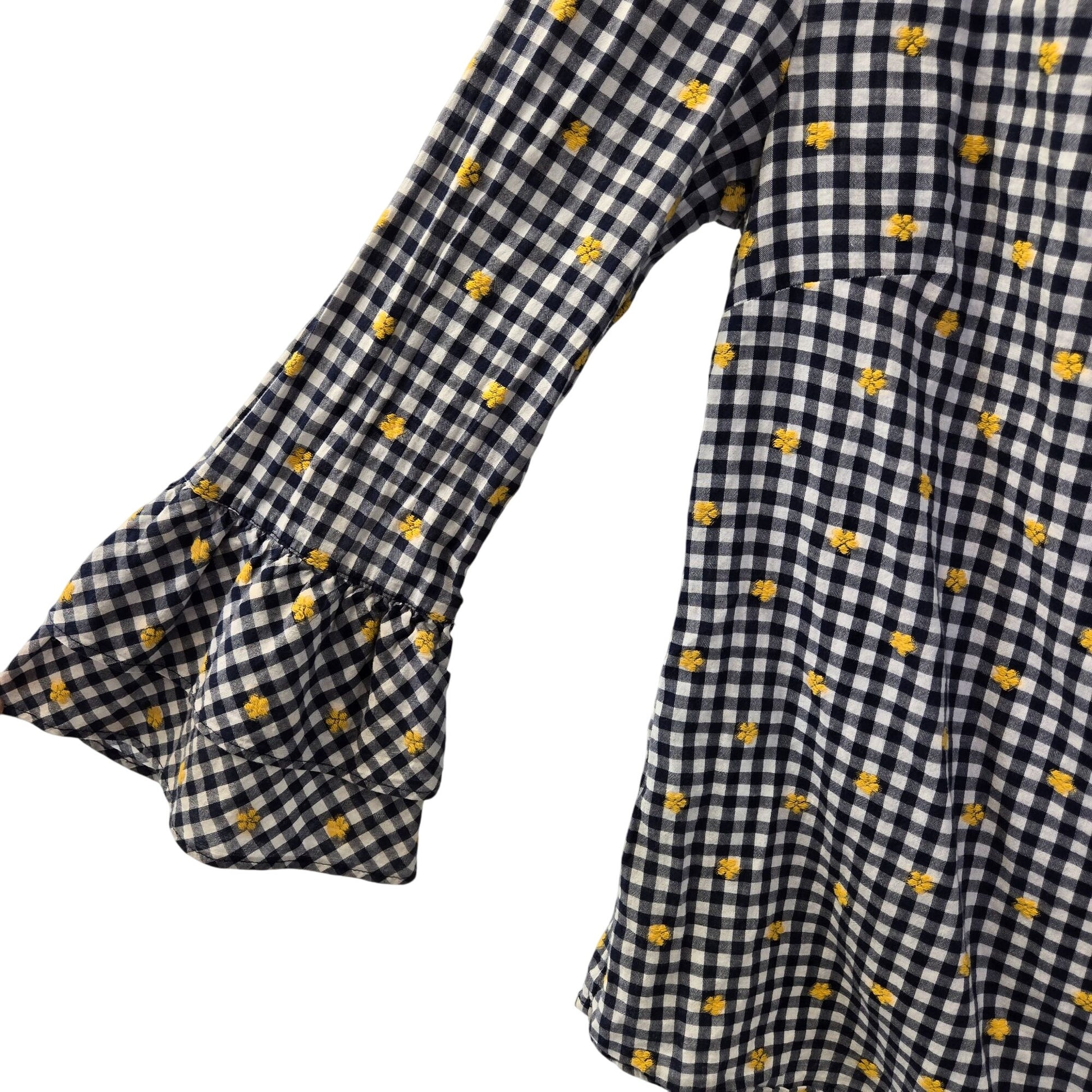 Adorable gingham print blouse with yellow embroidered flowers throughout. Tiered bell sleeve gives this popover top just a little extra. Pair with trouser pants or jeans.