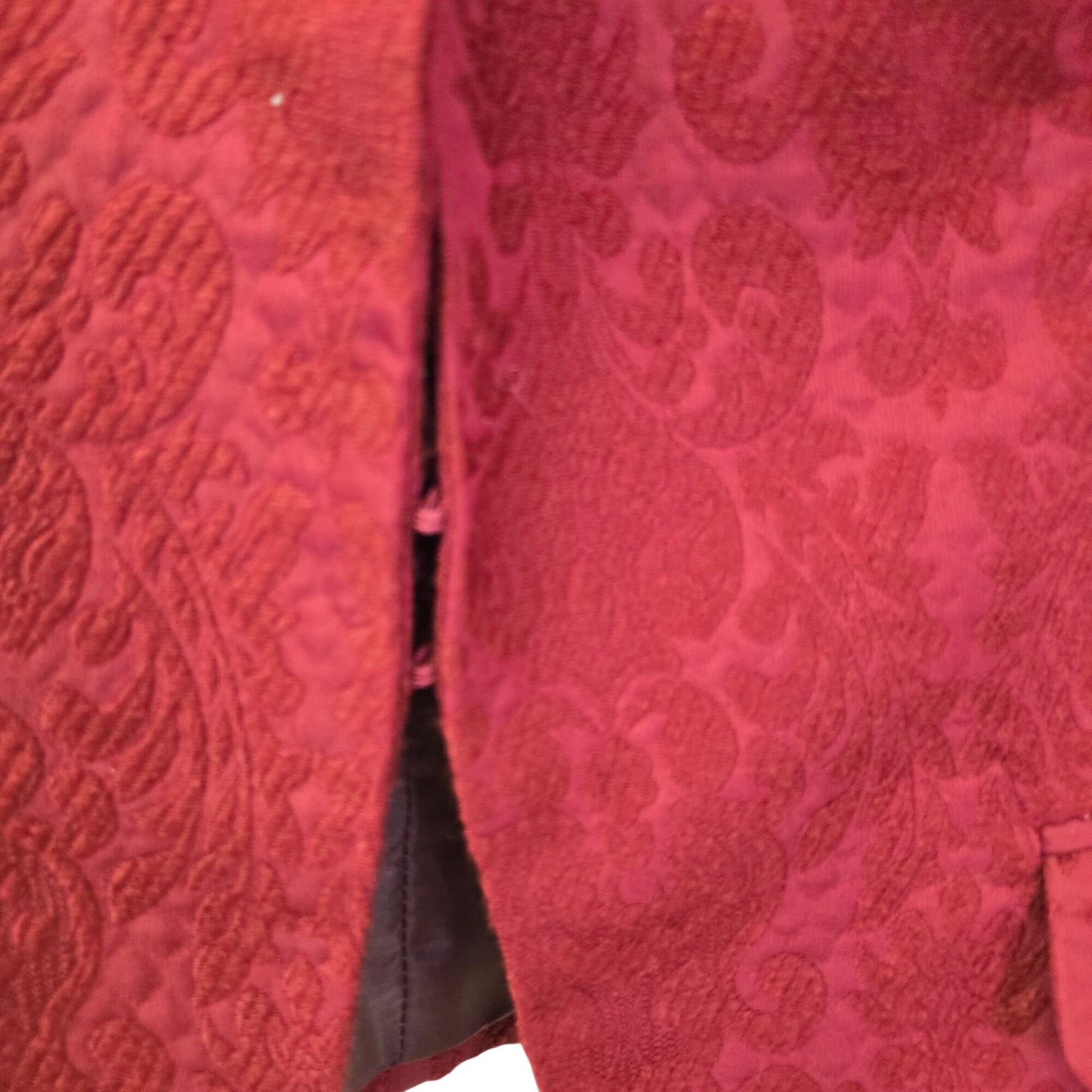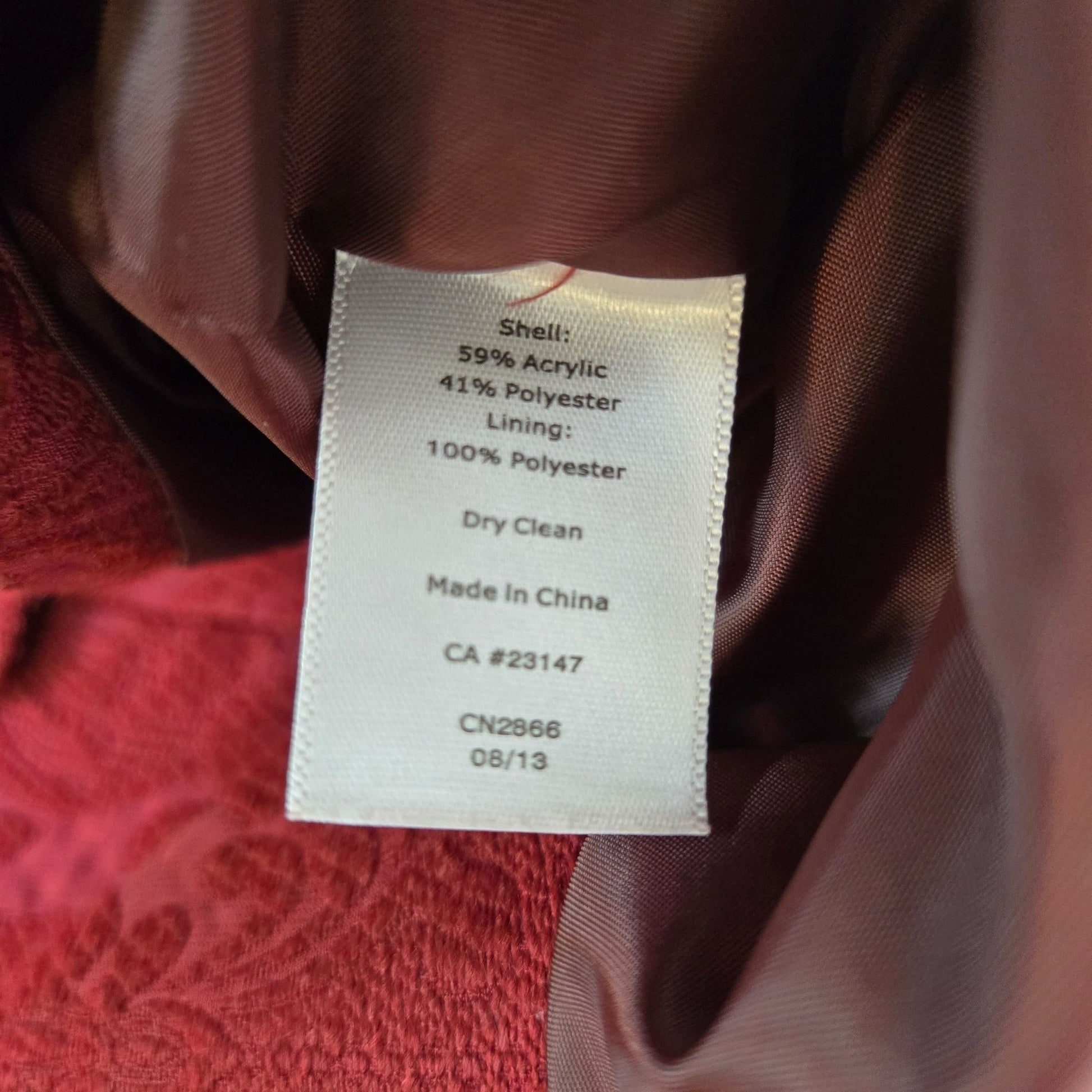 Really pretty burgundy color blazer jacket that has jacquard texture to it and two hook and eye closures at the front. This could be worn open or closed. Pair with a skirt or trouser pants for a Holiday or work event or even with a dress.