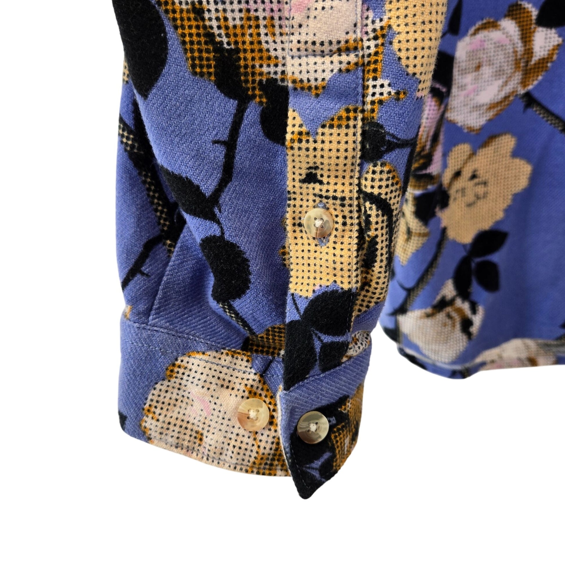 Really unique floral full button closure hooded shacket sweatshirt. The color on this is very vibrant so this is still in really good condition.