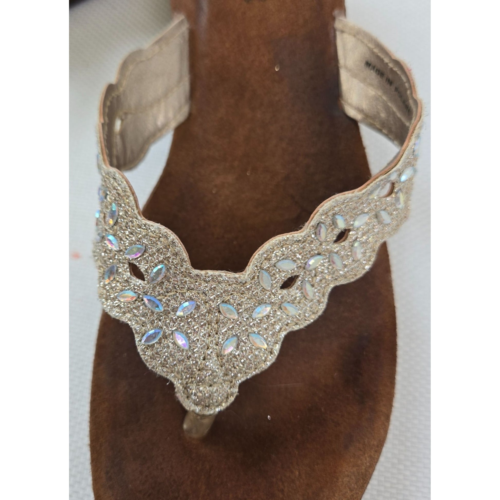 Really cute comfort thong sandals that have metallic straps that are scalloped and beaded. Great to dress up or down.