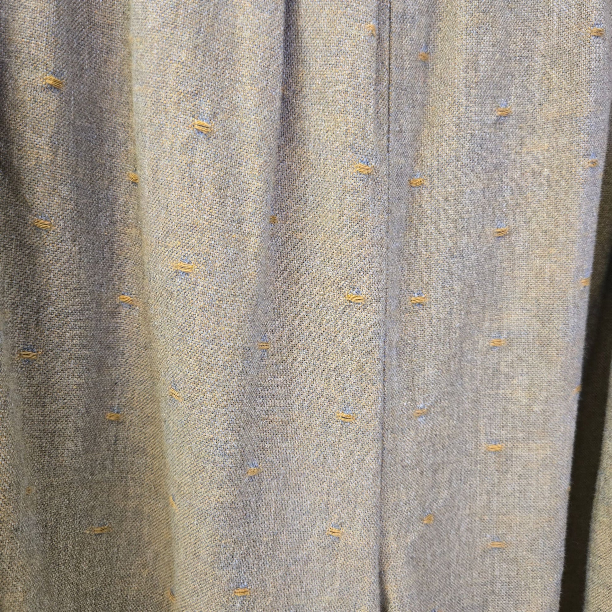 Nice and lightweight cotton wide leg pants that have a paper bag waist with attached tie and side zipper closure. There is a little texture and pattern to this with some light orange squares sprinkled throughout. Side pockets.