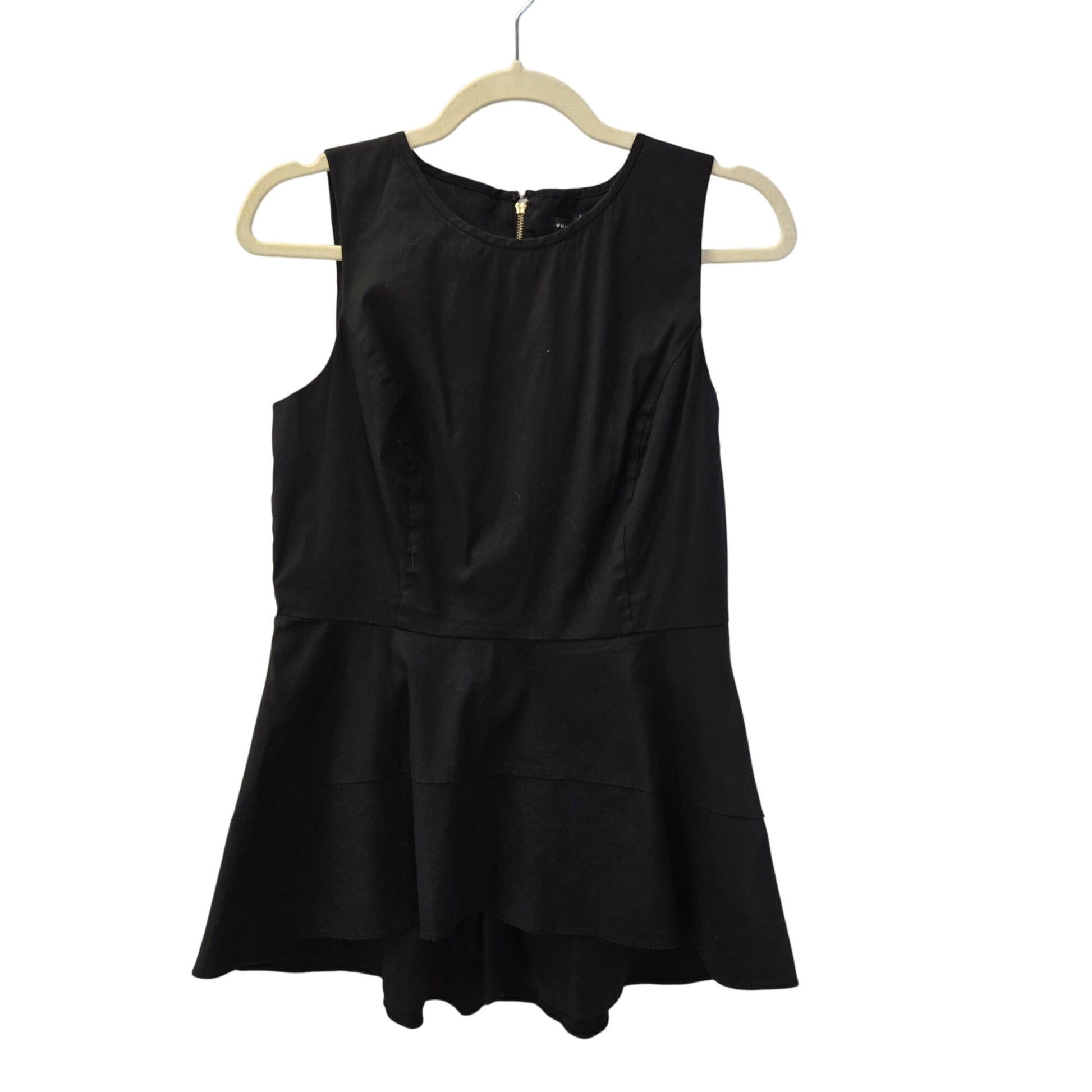 Great closet staple, this peplum top is versatile enough to be worn with jeans or with trouser pants or a skirt. Sleeveless and back exposed zipper closure. The zipper hardware is shiny gold.